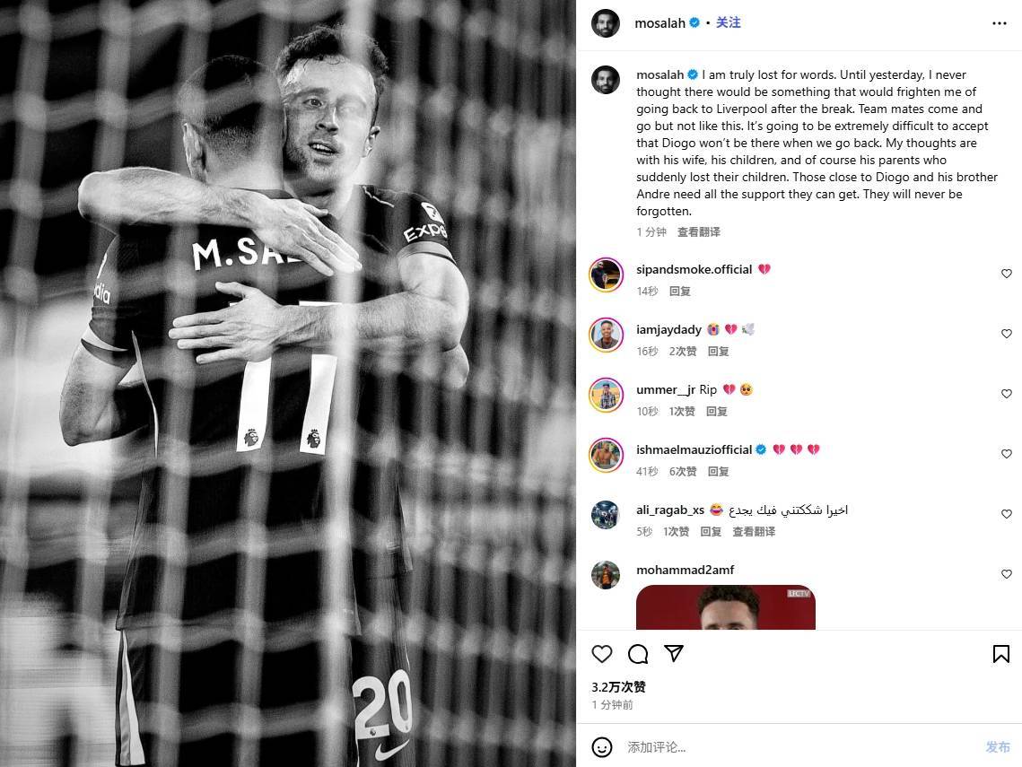 萨拉赫悼念若塔:从未想过回到利物浦让我害怕,实在难以接受